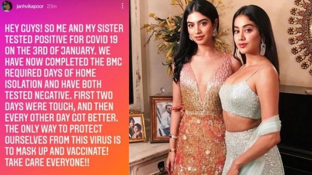 ਇਸ ਬਾਰੇ ਹੁਣ ਜਾਹਨਵੀ ਨੇ ਆਪਣੇ ਇੰਸਟਾ ਸਟੋਰੀ 'ਤੇ ਪੋਸਟ ਪਾ ਕੇ ਦੱਸਿਆ ਕਿ ਉਹ ਤੇ ਉਸ ਦੀ ਭੈਣ ਦੋਵੇਂ ਕੋਰੋਨਾ ਪੌਜ਼ੀਟਿਵ ਹਨ। ਉਨ੍ਹਾਂ ਨੂੰ ਹਲਕੇ ਲੱਛਣ ਸਨ, ਜਿਸ ਦੇ ਚਲਦੇ ਉਨ੍ਹਾਂ ਨੇ ਟੈਸਟ ਕਰਵਾਇਆ ਤਾਂ ਉਨ੍ਹਾਂ ਦੀ ਰਿਪੋਰਟ ਪੌਜ਼ੀਟਿਵ ਆਈ ਹੈ। ਜਾਹਨਵੀ ਨੇ ਲੋਕਾਂ ਨੂੰ ਡਬਲ ਮਾਸਕ ਪਾਉਣ ਅਤੇ ਕੋਰੋਨਾ ਦੇ ਨਿਯਮਾਂ ਦੀ ਪਾਲਣਾ ਕਰਨ ਦੀ ਅਪੀਲ ਕੀਤੀ ਹੈ।