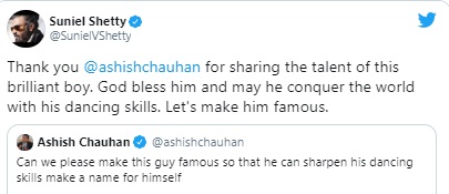 ਬੱਚੇ ਦੇ ਡਾਂਸ ਨੂੰ ਦੇਖ ਕੇ ਸੁਨੀਲ ਏਨੇਂ ਪ੍ਰਭਾਵਿਤ ਹੋਏ ਹਨ ਕਿ ਸੁਨੀਲ ਨੇ ਸਭ ਨੂੰ ਗੁਜਾਰਿਸ਼ ਕੀਤੀ ਹੈ ਕਿ ਉਹ ਬੱਚੇ ਦੀ ਵੀਡੀਓ ਸ਼ੇਅਰ ਕਰਕੇ ਉਸ ਨੂੰ ਫੇਮਸ ਬਨਾਉਣ । ਵੀਡੀਓ ਦੀ ਗੱਲ ਕੀਤੀ ਜਾਵੇ ਤਾਂ ਬੱਚਾ ਆਪਣੀ ਝੋਪੜੀ ਦੇ ਅੱਗੇ ਗੋਵਿੰਦਾ ਦੀ ਫ਼ਿਲਮ ਰਾਜਾ ਬਾਬੂ, ਕੁਲੀ ਨੰਬਰ 1 ਵਰਗੀਆਂ ਫ਼ਿਲਮਾ ਦੇ ਗਾਣਿਆਂ ਤੇ ਜ਼ਬਰਦਸਤ ਡਾਂਸ ਕਰ ਰਿਹਾ ਹੈ ।