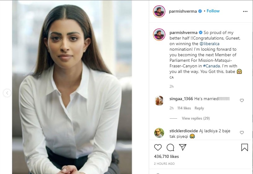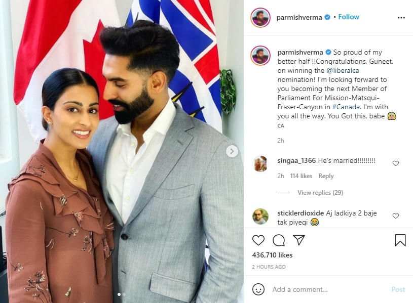 ਪੰਜਾਬੀ ਅਦਾਕਾਰ ਪ੍ਰਮੀਸ਼ ਵਰਮਾ (parmish verma) ਨੇ ਇੰਸਟਾਗ੍ਰਾਮ ਤੇ ਕੁਝ ਤਸਵੀਰਾਂ ਸ਼ੇਅਰ ਕਰਕੇ ਹਜ਼ਾਰਾਂ ਕੁੜੀਆਂ ਦਾ ਦਿਲ ਤੋੜ ਦਿੱਤਾ ਹੈ, ਕਿਉਂਕਿ ਪ੍ਰਮੀਸ਼ ਵਰਮਾ ਨੇ ਪਹਿਲੀ ਵਾਰ ਆਪਣੀ ਗਰਲ ਫਰੈਂਡ ਬਾਰੇ ਖੁਲਾਸਾ ਕੀਤਾ ਹੈ । ਪ੍ਰਮੀਸ਼ ਵਰਮਾ (parmish verma) ਦੀ ਗਰਲ ਫਰੈਂਡ ਦਾ ਨਾਂਅ ਗੁਨੀਤ (Guneet) ਹੈ । ਗੁਨੀਤ (Guneet) ਕੈਨੇਡਾ ਦੀ ਲਿਬਰਲ ਪਾਰਟੀ ਵੱਲੋਂ ਸਾਂਸਦ ਮੈਂਬਰ ਲਈ ਨਾਮਜਦ ਕੀਤੀ ਗਈ ਹੈ ।