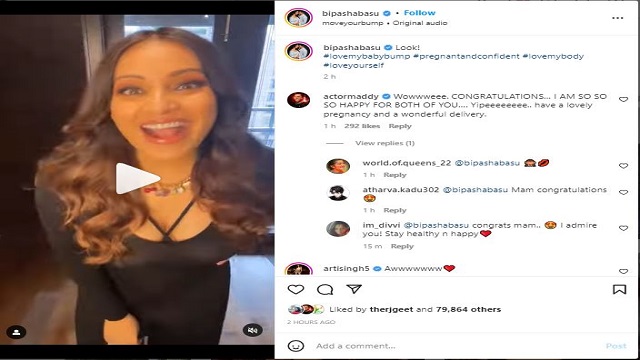 ਇਸ ਵੀਡੀਓ ਉੱਤੇ ਬਾਲੀਵੁੱਡ ਅਦਾਕਾਰ ਆਰ.ਮਾਧਵਨ ਨੇ ਵੀ ਕਮੈਂਟ ਕੀਤਾ ਹੈ। ਆਰ.ਮਾਧਵਨ ਨੇ ਬਿਪਾਸ਼ਾ ਤੇ ਕਰਨ ਨੂੰ ਮਾਤਾ-ਪਿਤਾ ਬਨਣ 'ਤੇ ਵਧਾਈ ਦਿੱਤੀ। ਉਨ੍ਹਾਂ ਨੇ ਕਮੈਂਟ 'ਚ ਲਿਖਿਆ, "Wowwweee. CONGRATULATIONS… I AM SO SO SO HAPPY FOR BOTH OF YOU…. Yipeeeeeeee.. have a lovely pregnancy and a wonderful delivery."