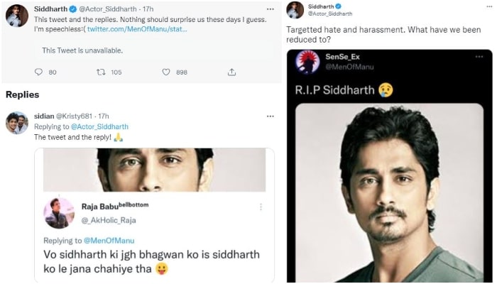“Targetted hate and harassment,” he said. What have we come to?” he wrote, alongside a screenshot of a tweet with his image and the caption "RIP Siddharth."