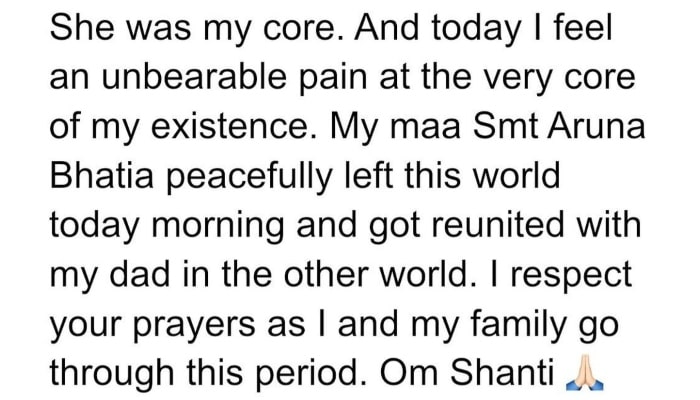 Akshay Kumar's mother Aruna Bhatia, passed away on Wednesday morning. Akshay Kumar took to his social media accounts to confirm the tragic news, and wrote, "She was my core. And today I feel an unbearable pain at the very core of my existence. My maa Smt Aruna Bhatia left this world today morning and got reunited with my dad in the other world. I respect your prayers as I and my family go through this period. Om Shanti."