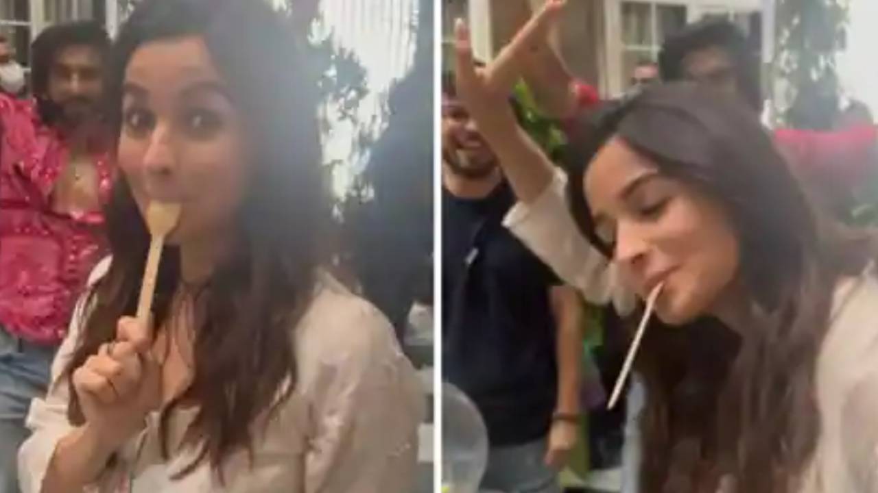 Alia Bhatt, while dancing, was seen having a spoon in her mouth. Ranveer Singh who is also grooving behind her in the background claps for her along with other crew members.