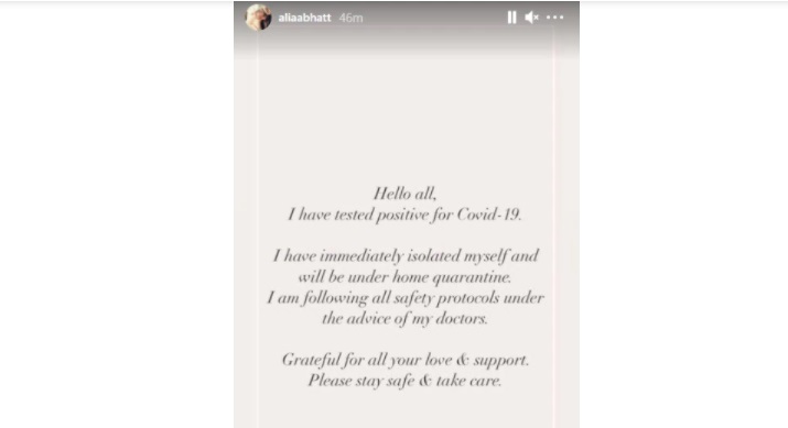 ਆਲੀਆ ਨੇ ਆਪਣੇ ਆਪ ਨੂੰ ਘਰ ਵਿੱਚ ਹੀ ਇਕਾਂਤਵਾਸ ਵਿੱਚ ਰੱਖ ਲਿਆ ਸੀ । ਆਲੀਆ ਦੇ ਵਰਕ ਫਰੰਟ ਦੀ ਗੱਲ ਕੀਤੀ ਜਾਵੇ ਤਾਂ ਉਹ ਫ਼ਿਲਮ ਗੰਗੂਬਾਈ ਕਠਿਆਵਾੜੀ ਵਿੱਚ ਨਜ਼ਰ ਆਉਣ ਵਾਲੀ ਹੈ ਜਿਸ ਦਾ ਟ੍ਰੇਲਰ ਕੁਝ ਦਿਨ ਪਹਿਲਾਂ ਰਿਲੀਜ਼ ਹੋਇਆ ਹੈ।