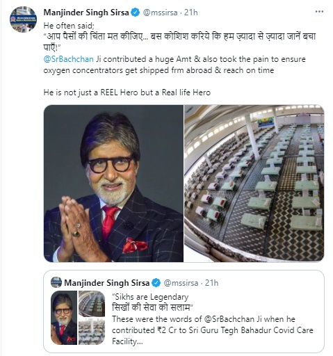 ਕੋਰੋਨਾ ਮਹਾਮਾਰੀ ਵਿਚ ਜਿੱਥੇ ਲੋਕਾਂ ਦੀ ਲਗਤਾਰ ਮੌਤ ਹੋ ਰਹੀ ਹੈ ਉੱਥੇ ਸਿੱਖ ਭਾਈਚਾਰਾ ਲੋਕਾਂ ਦੀ ਜਾਨ ਬਚਾਉਣ ਲਈ ਲਗਤਾਰ ਸੇਵਾ ਨਿਭਾ ਰਿਹਾ ਹੈ । ਇਸ ਸਭ ਤੋਂ ਬਾਲੀਵੁੱਡ ਅਦਾਕਾਰ ਬਹੁਤ ਪ੍ਰਭਾਵਿਤ ਹੋਏ ਹਨ । ਅਮਿਤਾਭ ਬਚਨ ਨੇ ਕੋਰੋਨਾ ਕਾਰਨ ਬਣੇ ਔਖੇ ਹਾਲਾਤਾਂ ਵਿਚ ਸਿੱਖਾਂ ਦੀ ਸੇਵਾ ਭਾਵਨਾ ਨੂੰ ਸਲਾਮ ਕੀਤਾ ਹੈ। ਜਿਸ ਦੀ ਜਾਣਕਾਰੀ ਮਨਜਿੰਦਰ ਸਿੰਘ ਸਿਰਸਾ ਨੇ ਆਪਣੇ ਸੋਸ਼ਲ ਮੀਡੀਆ ਅਕਾਊਂਟ ਤੇ ਇੱਕ ਪੋਸਟ ਸ਼ੇਅਰ ਕਰਦੇ ਹੋਏ ਦਿੱਤੀ ਹੈ ।