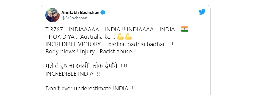 ਅਮਿਤਾਬ ਨੇ ਹਿੰਦੀ ਫੌਂਟ 'ਚ ਪੰਜਾਬੀ ਕੈਪਸ਼ਨ 'ਚ ਲਿਖਿਆ, "ਗਲੇ 'ਤੇ ਹੱਥ ਨਾ ਰੱਖੀ, ਠੋਕ ਦਿਆਂਗੇ" ਅਮਿਤਾਭ ਬੱਚਨ ਹਮੇਸ਼ਾ ਕ੍ਰਿਕੇਟ ਨੂੰ ਬਾਖ਼ੂਬੀ ਫੋਲੋ ਕਰਦੇ ਹਨ। ਇਸੇ ਕਾਰਨ ਇੰਡੀਆ ਦੀ ਇਸ ਜਿੱਤ 'ਤੇ ਅਮਿਤਾਭ ਨੇ ਪੰਜਾਬੀ ਅੰਦਾਜ਼ 'ਚ ਟਵੀਟ ਕੀਤਾ ਹੈ। ਬਾਲੀਵੁੱਡ ਕਿੰਗ ਸ਼ਾਹਰੁਖ ਖ਼ਾਨ ਨੇ ਵੀ ਟੀਮ ਇੰਡੀਆ ਨੂੰ ਆਸਟ੍ਰੇਲੀਆ ਦੀ ਜ਼ਮੀਨ 'ਤੇ ਵਿਕਟਰੀ ਹਾਸਿਲ ਕਰਨ ਲਈ ਵਧਾਈ ਦਿੱਤੀ ਹੈ।