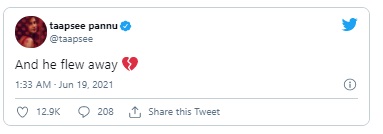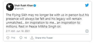 ਬਾਲੀਵੁੱਡ ਅਦਾਕਾਰ ਸ਼ਾਹਰੁਖ਼ ਖ਼ਾਨ ਨੇ ਟਵਿੱਟਰ 'ਤੇ ਲਿਖਿਆ, 'ਫਲਾਇੰਗ ਸਿੱਖ ਹੁਣ ਵਿਅਕਤੀਗਤ ਰੂਪ 'ਚ ਸਾਡੇ ਵਿਚਕਾਰ ਨਹੀਂ ਰਹੇ ਪਰ ਉਨ੍ਹਾਂ ਦੀ ਮੌਜੂਦਗੀ ਹਮੇਸ਼ਾ ਮਹਿਸੂਸ ਕੀਤੀ ਜਾਵੇਗੀ ਤੇ ਉਨ੍ਹਾਂ ਦੀ ਵਿਰਾਸਤ ਬੇਜੋੜ ਰਹੇਗੀ.. ਮੇਰੇ ਲਈ ਇਕ ਪ੍ਰੇਰਣਾ... ਲੱਖਾਂ ਲੋਕਾਂ ਲਈ ਪ੍ਰੇਰਣਾ। ਮਿਲਖਾ ਸਿੰਘ ਸਰ ਤੁਹਾਡੀ ਆਤਮਾ ਨੂੰ ਸ਼ਾਂਤੀ ਮਿਲੇ।' ਤਾਪਸੀ ਪਨੂੰ ਨੇ ਵੀ ਮਿਲਖਾ ਸਿੰਘ ਦੇ ਦਿਹਾਂਤ 'ਤੇ ਦੁੱਖ ਵਿਅਕਤ ਕੀਤਾ।