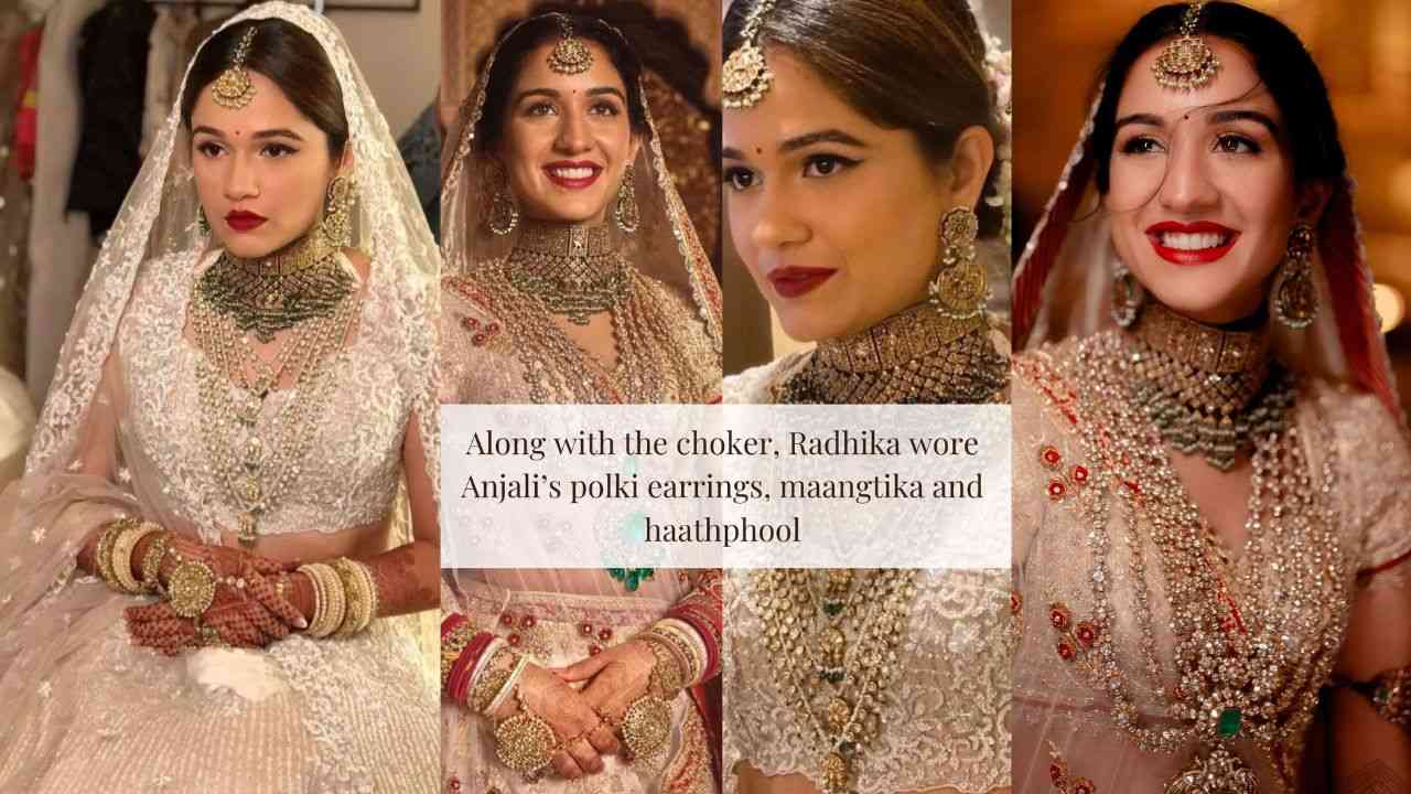 In a heartfelt nod to family tradition, Radhika wore her sister Anjali Merchant's jewellery for the wedding. This included a choker, polka earrings, a maangtika, and a haathphool. Radhika had previously worn Anjali's polki set for Isha Ambani's wedding reception in 2018, and for her own D-Day, she chose to re-wear her sister's jewels, leaving everyone in awe of her timeless and sentimental choice.