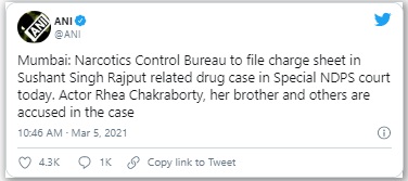 ਸੁਸ਼ਾਂਤ ਸਿੰਘ ਰਾਜਪੂਤ ਨਾਲ ਸਬੰਧਤ ਡਰੱਗ ਕੇਸ ਵਿੱਚ ਅਦਾਲਤ ਵਿੱਚ ਚਾਰਜਸ਼ੀਟ ਦਾਖਿਲ ਕੀਤੀ ਗਈ ਹੈ । ਤੁਹਾਨੂੰ ਦੱਸ ਦਿੰਦੇ ਹਾਂ ਕਿ ਸੁਸ਼ਾਂਤ ਦੀ ਸਾਬਕਾ ਪ੍ਰੇਮਿਕਾ ਰਿਆ ਚੱਕਰਵਰਤੀ, ਉਸ ਦੇ ਭਰਾ ਸ਼ੌਵਿਕ ਸਮੇਤ ਹੋਰ ਕਈ ਲੋਕ ਇਸ ਮਾਮਲੇ ਵਿਚ ਮੁਜ਼ਰਮ ਹਨ । ਇਸ ਚਾਰਜ਼ਸੀਟ ਵਿੱਚ 33 ਮੁਲਜ਼ਮਾਂ ਅਤੇ 200 ਗਵਾਹਾਂ ਦੇ ਬਿਆਨ ਹਨ।