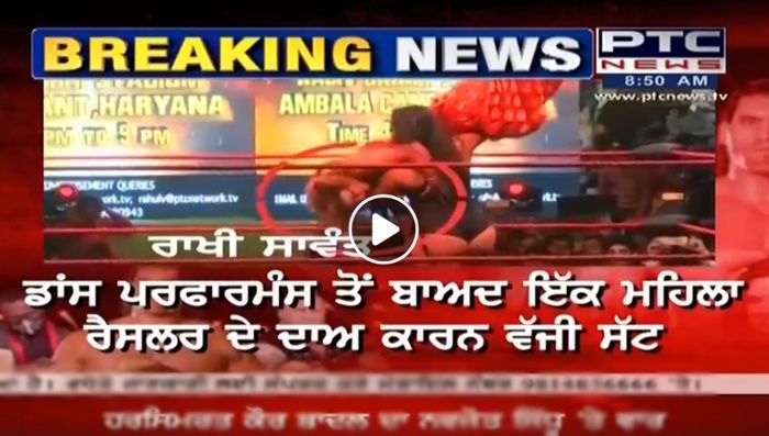 Rakhi was dancing in the ring when a woman wrestler asked her to fight with her. After an argument between the two, the wrestler lifted up the actress and threw her on the floor of the ring.