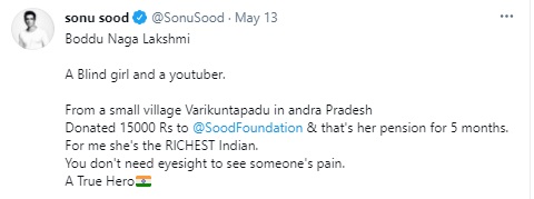 ਆਂਧਰਾ ਪ੍ਰਦੇਸ਼ ਦੇ ਇਕ ਛੋਟੇ ਜਿਹੇ ਪਿੰਡ ਦੀ ਰਹਿਣ ਵਾਲੀ ਲਕਸ਼ਮੀ ਨੇ ਸੂਦ ਫਾਉਂਡੇਸ਼ਨ ਨੂੰ 15,000 ਰੁਪਏ ਦਾਨ ਕੀਤੇ ਹਨ। ਇਹ ਰਕਮ ਉਸਦੀ ਪੰਜ ਮਹੀਨੇ ਦੀ ਪੈਨਸ਼ਨ ਹੈ। ਉਹ ਮੇਰੇ ਲਈ ਸਭ ਤੋਂ ਅਮੀਰ ਭਾਰਤੀ ਹੈ। ਕਿਸੇ ਦੇ ਦੁੱਖ ਨੂੰ ਵੇਖਣ ਲਈ ਅੱਖਾਂ ਦੀ ਜਰੂਰਤ ਨਹੀਂ ਹੁੰਦੀ। ਉਹ ਅਸਲੀ ਹੀਰੋ ਹੈ।