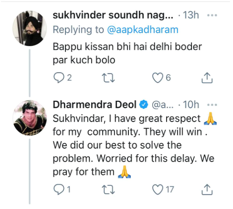 ਦਰਅਸਲ ਟਵਿੱਟਰ ’ਤੇ ਇੱਕ ਯੂਜਰ ਨੇ ਧਰਮਿੰਦਰ ਨੂੰ ਸਵਾਲ ਕੀਤਾ ਸੀ ਕਿ ਉਹ ਤੇ ਉਸ ਦਾ ਪਰਿਵਾਰ ਕਿਸਾਨਾਂ ਦੇ ਮਸਲੇ ਤੇ ਕਿਉਂ ਨਹੀਂ ਬੋਲਦਾ ਜਿਸ ਦੇ ਜਵਾਬ ਵਿੱਚ ਧਰਮਿੰਦਰ ਨੇ ਕਿਹਾ ਕਿ ਉਹ ਆਪਣੇ ਭਾਈਚਾਰੇ ਦਾ ਸਤਿਕਾਰ ਕਰਦੇ ਹਨ। ਕਿਸਾਨ ਜ਼ਰੂਰ ਜਿੱਤਣਗੇ। ਉਨ੍ਹਾਂ ਦੇ ਮਸਲੇ ਦਾ ਹੱਲ ਕਰਨ ਲਈ ਵੱਧ ਤੋਂ ਵੱਧ ਕੋਸ਼ਿਸ਼ਾਂ ਹੋਈਆਂ। ਪਰ ਇਸ ਵਿਚ ਹੋ ਰਹੀ ਦੇਰੀ ਚਿੰਤਾ ਦਾ ਵਿਸ਼ਾ ਹੈ।