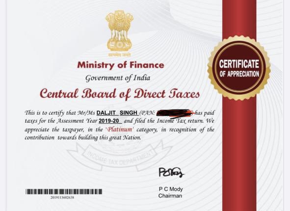 ਉਹਨਾਂ ਦੱਸਿਆ ਕਿ ਕਿ ਭਾਰਤ ਸਰਕਾਰ ਨੇ ਉਸ ਨੂੰ ਟੈਕਸ ਅਦਾ ਕਰਨ ਤੇ ਸਾਲ 2019-2020 ਲਈ ਇਨਕਮ ਟੈਕਸ ਰਿਟਰਨ ਭਰਨ ਤੇ ਸਨਮਾਨਿਤ ਕੀਤਾ ਹੈ। ਸਰਟੀਫਿਕੇਟ ਵਿੱਚ ਲਿਖਿਆ ਹੈ, "ਅਸੀਂ ਇਸ ਮਹਾਨ ਰਾਸ਼ਟਰ ਦੇ ਨਿਰਮਾਣ ਵਿੱਚ ਯੋਗਦਾਨ ਦੇ ਸਨਮਾਨ ਵਿੱਚ, ਪਲੈਟੀਨਮ ਸ਼੍ਰੇਣੀ ਵਿੱਚ, ਟੈਕਸਦਾਤਾ ਦੀ ਸ਼ਲਾਘਾ ਕਰਦੇ ਹਾਂ।"