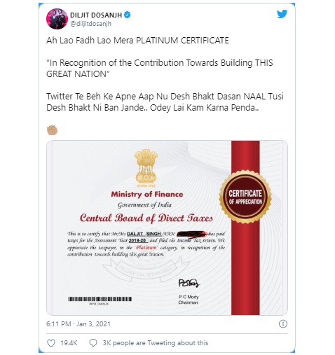 ਦਰਅਸਲ ਦਿਲਜੀਤ ਦੋਸਾਂਝ ਨੇ ਆਪਣੇ ਟ੍ਰੋਲਰਜ਼ ਨੂੰ ਵਿੱਤ ਮੰਤਰਾਲੇ ਵੱਲੋਂ ਮਿਲੀ ਸਰਟੀਫੀਕੇਟ ਨਾਲ ਜਵਾਬ ਦਿਤਾ ਹੈ। ਦਿਲਜੀਤ ਨੇ ਆਪਣੇ ਟਵਿੱਟਰ ਹੈਂਡਲ ਤੇ ਵਿੱਤ ਮੰਤਰਾਲੇ ਵਲੋਂ ਜਾਰੀ ਕੀਤਾ ਗਿਆ "ਪਲੈਟੀਨਮ ਸਰਟੀਫਿਕੇਟ" ਸਾਂਝਾ ਕੀਤਾ ਹੈ ।