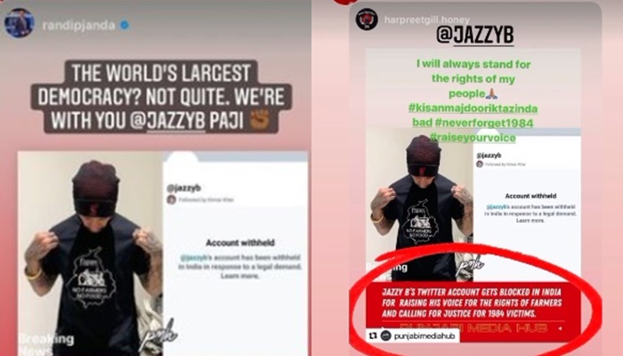 ਇਸ ਤੋਂ ਪਹਿਲਾਂ ਦੀ ਗੱਲ ਕੀਤੀ ਜਾਵੇ ਤਾਂ ਜੈਜ਼ੀ ਬੀ ਨੇ ਆਪਣੇ ਇੰਸਟਾਗ੍ਰਾਮ ਅਕਾਊਂਟ 'ਤੇ ਲਿਖਿਆ ਕਿ ਕਿਸਾਨਾਂ ਦੇ ਹੱਕ ਵਿਚ ਅਤੇ 84 ਦੇ ਬਾਰੇ ਆਪਣੇ ਵਿਚਾਰ ਬਿਆਨ ਕਰਨ ਕਰਕੇ ਉਸਦਾ ਟਵਿੱਟਰ ਅਕਾਊਂਟ ਬਲਾਕ ਕੀਤਾ ਗਿਆ। ਉਸਦਾ ਅਕਾਊਂਟ ਖੋਲ੍ਹਣ 'ਤੇ, ਇਹ ਲਿਖਿਆ ਹੈ ਕਿ ਕਾਨੂੰਨੀ ਕਾਰਨਾਂ ਕਰਕੇ ਉਹਨਾਂ ਦਾ ਅਕਾਊਂਟ ਰੋਕ ਦਿੱਤਾ ਗਿਆ ਹੈ।