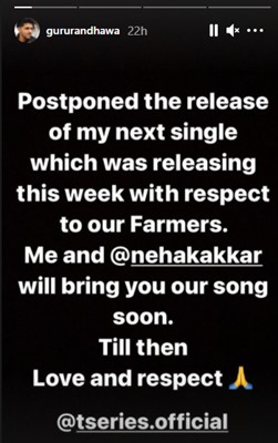 Guru shared this news on his social media story, wherein he clearly mentioned - “Postponed the release of my next single which was releasing this week with respect to our farmers. Me and Neha Kakkar will bring you our song soon. Till then love and respect.”