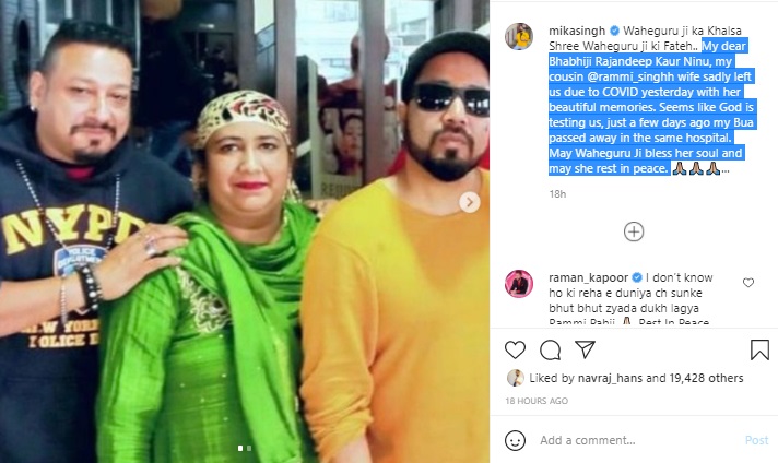 ਜਿਸ ਵਿਚ ਉਨ੍ਹਾਂ ਨੇ ਦੱਸਿਆ ਹੈ ਕਿ ਕੋਰੋਨਾ ਨਾਲ ਉਹਨਾਂ ਦੀ ਭਰਜਾਈ ਦੀ ਮੌਤ ਹੋ ਗਈ ਹੈ । ਮੀਕਾ ਸਿੰਘ ਨੇ ਆਪਣੀ ਭਰਜਾੲi ਦੀ ਤਸਵੀਰ ਸਾਂਝੀ ਕਰਦੇ ਹੋਏ ਲਿਖਿਆ ‘ਮੇਰੇ ਪਿਆਰੇ ਭਾਬੀ ਜੀ ਰਾਜਨਦੀਪ ਕੌਰ ਨੀਨੂੰ ਮੇਰੇ ਚਚੇਰੇ ਭਰਾ ਰਿੰਮੀ ਸਿੰਘ ਦੀ ਘਰ ਵਾਲੀ ਕੋਵਿਡ ਦੀ ਬਿਮਾਰੀ ਕਰਕੇ ਸਾਨੂੰ ਛੱਡ ਕੇ ਚਲੇ ਗਏ ।