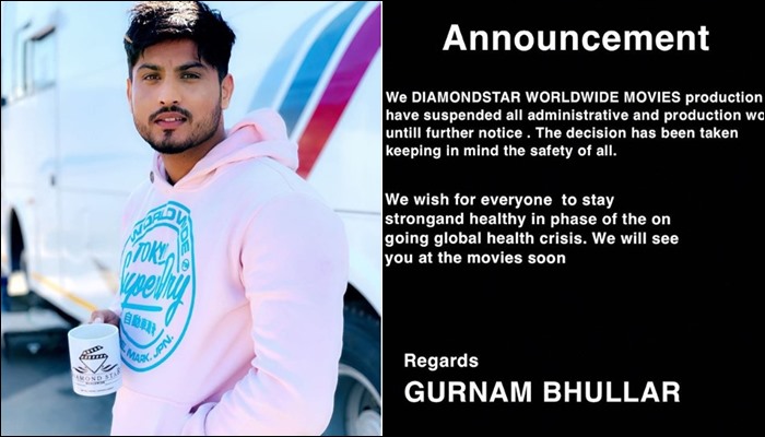 The Punjabi artist took to his social media handle to share the news. He wrote - “We Diamond Star Worldwide Movies production have suspended all administrative and production work until further notice. The decision has been taken keeping in mind the safety of all. We wish for everyone to stay strong and healthy in phase of the ongoing global health crisis. We will see you at the movies soon. Regards Gurnam Bhullar”