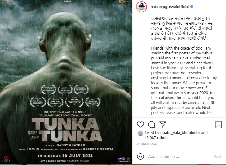 ਇਸ ਪੋਸਟਰ ਨੂੰ ਸਾਂਝੇ ਕਰਦਿਆਂ ਹਰਦੀਪ ਗਰੇਵਾਲ ਨੇ ਲਿਖਿਆ ਦੋਸਤੋ ਰੱਬ ਦੀ ਮਿਹਰ ਨਾਲ ਆਖ਼ਰ ਮੈਂ ਆਪਣੀ ਪਹਿਲੀ ਫ਼ਿਲਮ ਤੁਣਕਾ ਤੁਣਕਾ ਦਾ ਪੋਸਟਰ ਤੁਹਾਡੇ ਨਾਲ ਸਾਂਝਾ ਕਰ ਰਿਹਾ ਹਾਂ। ਇਸ ਫ਼ਿਲਮ ਦੀ ਸ਼ੁਰੂਆਤ ਦੋ ਹਜਾਰ ਸਤਾਰਾਂ ਵਿੱਚ ਹੋਈ ਸੀ ਤੇ ਉਦੋਂ ਤੋਂ ਹੁਣ ਤਕ ਮੈਂ ਆਪਣਾ ਸਭ ਕੁਝ ਦਾਅ ਤੇ ਲਾਇਆ। ਇਹ ਇੱਕ ਵਾਰ ਚ ਬਿਆਨ ਨਹੀਂ ਹੋਣਾ।