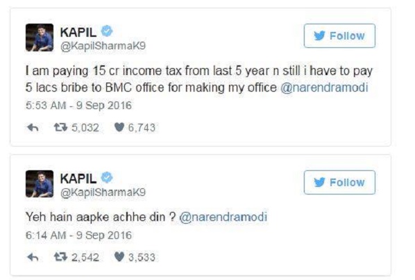 To remind you of the incident, kapil had tagged Prime Minister Narendra Modi in his tweet on 8th September saying, “I am paying 15 cr income tax from last 5 year n still i have to pay 5 lacs bribe to BMC office for making my office”. The comedian did not stop at that, as he went on to post questioning the PM saying, “Yeh hain aapke achhe din ?”.