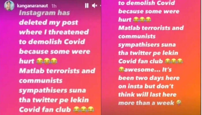ਕੰਗਨਾ ਨੇ ਲਿਖਿਆ, 'ਇੰਸਟਾਗ੍ਰਾਮ ਨੇ ਮੇਰੀ ਇਕ ਪੋਸਟ ਹਟਾ ਦਿੱਤੀ ਹੈ, ਜਿਸ ਵਿੱਚ ਮੈਂ ਕੋਵਿਡ ਨੂੰ ਖਤਮ ਕਰ ਦੇਣ ਦੀ ਧਮਕੀ ਦਿੱਤੀ ਸੀ। ਕਿਸੇ ਦੀਆਂ ਭਾਵਨਾਵਾਂ ਨੂੰ ਠੇਸ ਪਹੁੰਚ ਗਈ, ਮਤਲਬ ਕਿ ਅੱਤਵਾਦੀਆਂ ਅਤੇ ਕਮਿਊਨਿਸਟਾਂ ਨਾਲ ਹਮਦਰਦੀ ਰੱਖਣ ਵਾਲਾ ਸੁਣਿਆ ਸੀ ਟਵਿੱਟਰ 'ਤੇ , ਪਰ ਕੋਵਿਡ ਫੈਨ ਕਲੱਬ ਕਮਾਲ ਹੈ। ਇੰਸਟਾ 'ਤੇ ਦੋ ਦਿਨ ਹੋਏ ਹਨ, ਪਰ ਲੱਗਦਾ ਨਹੀਂ ਕਿ ਇਥੇ ਇਕ ਹਫਤੇ ਤੋਂ ਜ਼ਿਆਦਾ ਟਿਕ ਸਕਾਂਗੀ।''