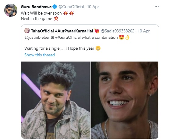 ਟਵੀਟ ਦੀ ਗੱਲ ਕੀਤੀ ਜਾਵੇ ਤਾਂ ਗੁਰੁ ਦੀ ਇੱਕ ਪ੍ਰਸ਼ੰਸ਼ਕ ਨੇ ਜਸਟਿਨ ਬੀਬਰ ਤੇ ਗੁਰੁ ਤਸਵੀਰ ਸ਼ੇਅਰ ਕੀਤੀ ਹੈ । ਇਸ ਤਸਵੀਰ ਤੇ ਕਿਸੇ ਨੇ ਕਮੈਂਟ ਕਰਕੇ ਲਿਖਿਆ ਕਿ ਜਸਟਿਨ ਨਾਲ ਗੁਰੂ ਕੌਂਬੀਨੇਸ਼ਨ ਕਮਾਲ ਦਾ ਹੋਏਗਾ ਤਾਂ ਗੁਰੂ ਨੇ ਇਸ ਦਾ ਜਵਾਬ ਦਿੰਦੇ ਹੋਏ ਕਿਹਾ ਕਿ ਇੰਤਜ਼ਾਰ ਜਲਦ ਹੀ ਖਤਮ ਹੋਏਗਾ।
