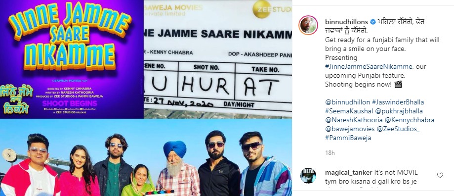 Sharing the news, Binnu Dhillon wrote - “Get ready for a funjabi family that will bring a smile on your face. Presenting #JinneJammeSaareNikamme, our upcoming Punjabi feature.Shooting begins now! ?”