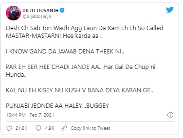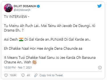 ' ਕੀ ਨਾਟਕ ਹੈ ਇਹ ? ਅਸੀਂ ਦੇਸ਼ ਦੀ ਗੱਲ ਕਰਦੇ ਆਂ...ਪੰਜਾਬ ਦੀ ਗੱਲ ਕਰਦੇ ਆਂ...ਇਹ ਧੱਕੇ ਨਾਲ ਹੋਰ ਹੀ ਐਂਗਲ ਦੇਣਾ ਚਾਹੁੰਦੀ ਆ...ਇਸ ਦਾ ਮਤਲਬ ਤੁਸੀਂ ਧੱਕੇ ਨਾਲ ਸਾਨੂੰ ਜੋ ਜੀਅ ਕਰਦੈ ਉਹ ਬਣਾਉਣਾ ਚਾਹੁੰਦੇ ਓ...ਵਾਹ।' ਇਸ ਤੋਂ ਇਲਾਵਾ ਦਿਲਜੀਤ ਨੇ ਕੰਗਨਾ ਰਣੌਤ ਸਬੰਧੀ ਪੰਜਾਬੀ 'ਚ ਵੀ ਟਵੀਟ ਕੀਤਾ ਹੈ।