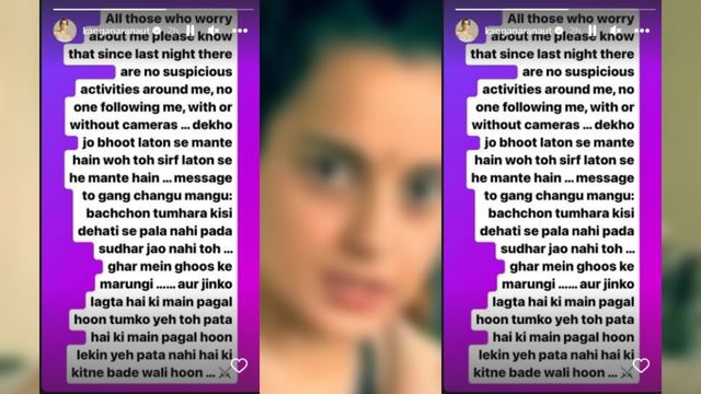 ਕੰਗਨਾ ਨੇ ਲਿਖਿਆ, ‘ਜੋ ਵੀ ਮੇਰੇ ਬਾਰੇ ਚਿੰਤਾ ਕਰ ਰਿਹਾ ਹੈ, ਕਿਰਪਾ ਕਰਕੇ ਜਾਣ ਲਓ ਕਿ ਬੀਤੀ ਰਾਤ ਤੋਂ ਮੇਰੇ ਆਸ-ਪਾਸ ਕੋਈ ਸ਼ੱਕੀ ਗਤੀਵਿਧੀ ਨਹੀਂ ਹੋਈ ਹੈ…ਕੋਈ ਵੀ ਕੈਮਰੇ ਨਾਲ ਜਾਂ ਬਿਨਾਂ ਕੈਮਰੇ ਮੇਰਾ ਪਿੱਛਾ ਨਹੀਂ ਕਰ ਰਿਹਾ...ਦੇਖੋ ਜੋ ਭੂਤ ਲਾਤਾਂ ਸੇ ਮਾਨਤੇ ਹੈ ਤੋਂ ਵੋ ਲਾਤਾਂ ਸੇ ਹੀ ਮਾਨਤੇ ਹੈ... ਚੰਗੂ ਮੰਗੂ ਨੂੰ ਸੁਨੇਹਾ: ਬੱਚਿਓ, ਤੁਹਾਨੂੰ ਕਿਸੇ ਦਿਹਾਤੀ ਵਾਲੇ ਨਾਲ ਪਾਲਾ ਨਹੀਂ ਪਿਆ, ਆਪਣੇ ਆਪ ਨੂੰ ਸੁਧਾਰੋ, ਨਹੀਂ ਤਾਂ ਮੈਂ ਘਰ ਵਿੱਚ ਵੜ ਕੇ ਤੁਹਾਨੂੰ ਮਾਰਾਂਗੀ’