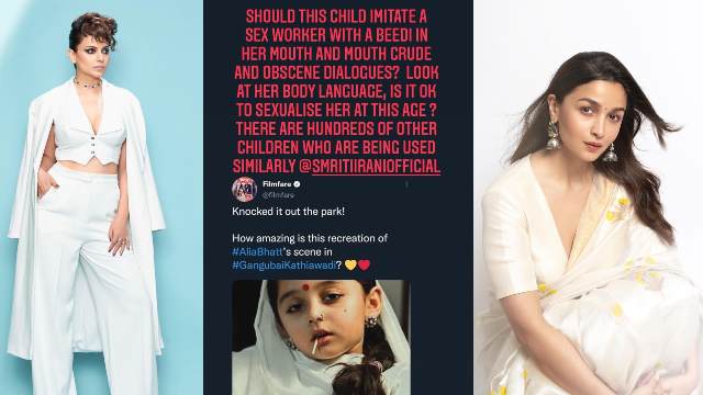 "Should this child imitate a sex worker with a beedi in her mouth and crude and obscene dialogues? Look at her body language, is it ok to sexualize her at this age? There are hundreds of other children who are being used similarly" wrote Kangana in her Instagram story.