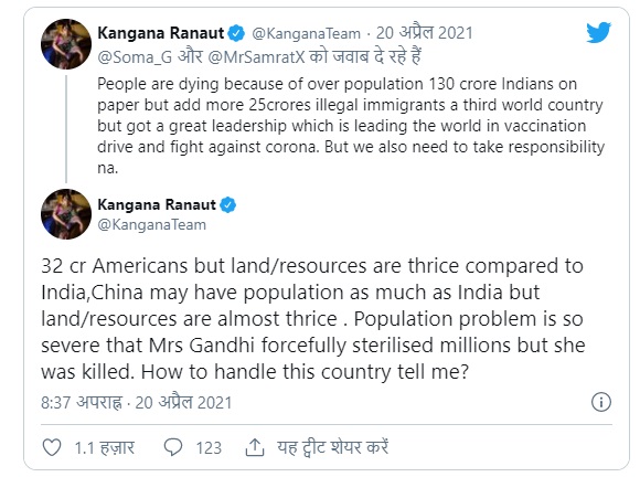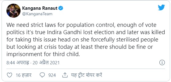 ਇਸ ਨੂੰ ਧਿਆਨ ਵਿਚ ਰੱਖਦਿਆਂ ਸਖ਼ਤ ਕਾਨੂੰਨ ਬਣਾਉਣ ਦੀ ਲੋੜ ਹੈ, ਜਿਸ ਦੇ ਤਹਿਤ ਤੀਜਾ ਬੱਚਾ ਹੋਣ ’ਤੇ ਜੁਰਮਾਨਾ ਜਾਂ ਜੇਲ੍ਹ ਦੀ ਸਜ਼ਾ ਹੋਣੀ ਚਾਹੀਦੀ ਹੈ’। ਇਸੇ ਤਰ੍ਹਾਂ ਦੇ ਇੱਕ ਇਕ ਹੋਰ ਟਵੀਟ ਵਿਚ ਕੰਗਨਾ ਨੇ ਲ਼ਿਖਿਆ ‘ਦੇਸ਼ ਵਿਚ ਜ਼ਿਆਦਾ ਅਬਾਦੀ ਕਾਰਨ ਲੋਕ ਮਰ ਰਹੇ ਹਨ।