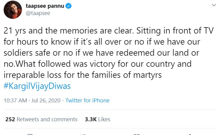 ਕ੍ਰਿਕੇਟਰ ਯੁਵਰਾਜ ਸਿੰਘ ਨੇ ਟਵੀਟ ਕਰਕੇ ਕਾਰਗਿਲ ਦੀ ਜੰਗ ‘ਚ ਸ਼ਹੀਦਾਂ ਹੋਏ ਜਵਾਨਾਂ ਨੂੰ ਯਾਦ ਕਰਦੇ ਪ੍ਰਣਾਮ ਕੀਤਾ ਹੈ । ਬਾਲੀਵੁੱਡ ਅਦਾਕਾਰਾ ਤਾਪਸੀ ਪਨੂੰ ਨੇ ਵੀ ਕਾਰਗਿਲ ਦੇ ਸ਼ਹੀਦਾਂ ਦੇ ਜਜ਼ਬੇ ਨੂੰ ਸਲਾਮ ਕਰਦੇ ਹੋਏ ਟਵੀਟ ਪੋਸਟ ਕੀਤਾ ਹੈ ।