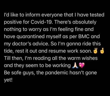 She wrote: “I’d like to inform everyone that I have tested positive for Covid-19. There’s absolutely nothing to worry as I’m feeling fine and have quarantined myself as per BMC and my doctor’s advice. So I’m gonna ride this tide, rest it out and resume work soon. Till then, I’m reading all the warm wishes and they seem to be working. Be safe guys, the pandemic hasn’t gone yet!”