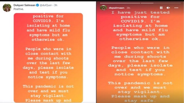 ਆਪਣੇ ਟਵਿੱਟਰ ਅਤੇ ਇੰਸਟਾਗ੍ਰਾਮ ਦੇ ਜ਼ਰੀਏ ਜਾਣਕਾਰੀ ਦਿੰਦੇ ਹੋਏ, ਦੁਲਕਰ ਸਲਮਾਨ ਨੇ ਲਿਖਿਆ ਕਿ ਉਨ੍ਹਾਂ ਦੀ ਕੋਰੋਨਾ ਰਿਪੋਰਟ ਪੌਜ਼ੀਟਿਵ ਆਈ ਹੈ। ਇਸ ਦੇ ਨਾਲ ਹੀ ਉਨ੍ਹਾਂ ਨੇ ਲਿਖਿਆ, 'ਮੇਰੇ ਵਿੱਚ ਹਲਕੇ ਲੱਛਣ ਹਨ ਪਰ ਮੈਂ ਠੀਕ ਹਾਂ ਅਤੇ ਘਰ ਵਿੱਚ ਅਲੱਗ ਰਹਿ ਰਿਹਾ ਹਾਂ। ਜੇਕਰ ਪਿਛਲੇ ਕੁਝ ਦਿਨਾਂ ਵਿੱਚ ਸ਼ੂਟਿੰਗ ਦੌਰਾਨ ਕੋਈ ਮੇਰੇ ਸੰਪਰਕ ਵਿੱਚ ਆਇਆ ਹੈ, ਤਾਂ ਕਿਰਪਾ ਕਰਕੇ ਆਪਣੇ ਆਪ ਨੂੰ ਅਲੱਗ ਰੱਖੋ ਅਤੇ ਜੇਕਰ ਤੁਹਾਨੂੰ ਕੋਈ ਲੱਛਣ ਦਿਖਾਈ ਦਿੰਦੇ ਹਨ ਤਾਂ ਆਪਣਾ ਕੋਵਿਡ ਟੈਸਟ ਕਰਵਾਓ।