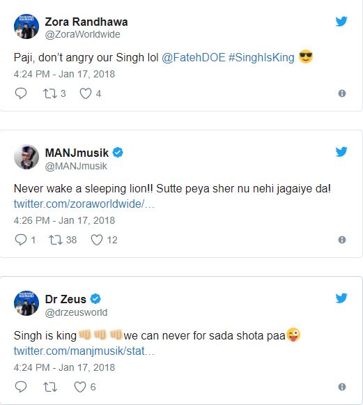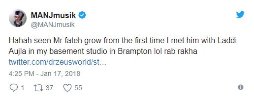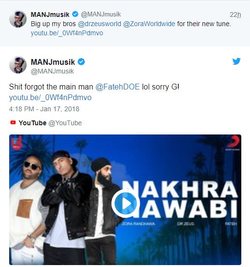 Manj Music, record producer/ singer and writer took to twitter to show his appreciation for the song and congratulated Dr. Zeus and Zora Randhawa only to realize later that he missed out on Fateh Doe.