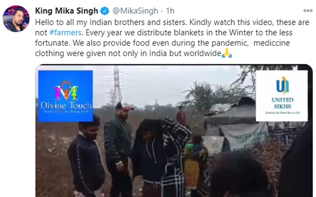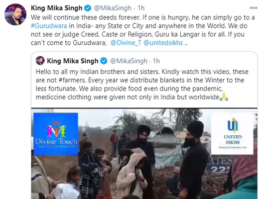 In a tweet, Mika wrote, “I Have Again request to all My #farmer brothers .. SHANTI BANAKE RAKHO (keep calm) NO NEED TO USE BAD WORDS / AARGUMENTS OR SHOUTING .. SOME PEOPLE ARE CREATING UNNECESSARY PROBLEMS JUST TO GiVE BAD MESSAGE. SO GUYS PLEASE KEEP CALM AND RELAXE. THANXXX.”