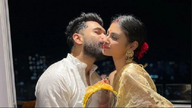 ਮੌਨੀ ਨੇ ਪਤੀ ਸੂਰਜ ਨੰਬਿਆਰ ਦੇ ਨਾਲ ਘਰ ਦੀ ਛੱਤ 'ਤੇ ਕਰਵਾ ਚੌਥ ਦੀ ਪੂਜਾ ਕੀਤੀ, ਇਸ ਮੌਕੇ 'ਤੇ ਉਹ ਆਪਣੇ ਪਤੀ ਨੂੰ ਛਾਨਣੀ ਰਾਹੀਂ ਰਵਾਇਤੀ ਤਰੀਕੇ ਨਾਲ ਦੇਖਦੀ ਨਜ਼ਰ ਆਈ। ਮੌਨੀ ਰਾਏ ਸੁਹਾਗ ਦੀ ਸੁਨਹਿਰੀ ਸਾੜ੍ਹੀ ਦੇ ਨਾਲ ਲਾਲ ਚੂੜੀ, ਬਨ 'ਚ ਗੁਲਾਬ ਦਾ ਫੁੱਲ ਲਗਾ ਕੇ ਬੇਹੱਦ ਖੂਬਸੂਰਤ ਨਜ਼ਰ ਆ ਰਹੀ ਸੀ , ਵਰਤ ਤੋੜਨ ਤੋਂ ਬਾਅਦ ਅਦਾਕਾਰਾ ਆਪਣੇ ਪਤੀ 'ਤੇ ਪਿਆਰ ਦੀ ਵਰਖਾ ਕਰਦੀ ਨਜ਼ਰ ਆਈ।