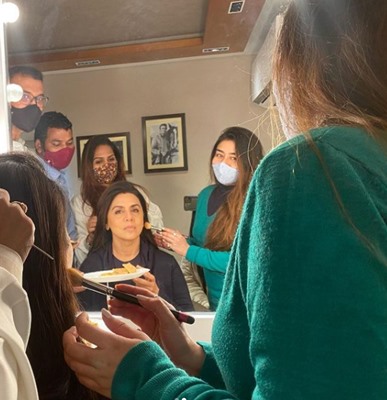 In the video, Neetu is seen seated on a chair as her team gets her makeup done.