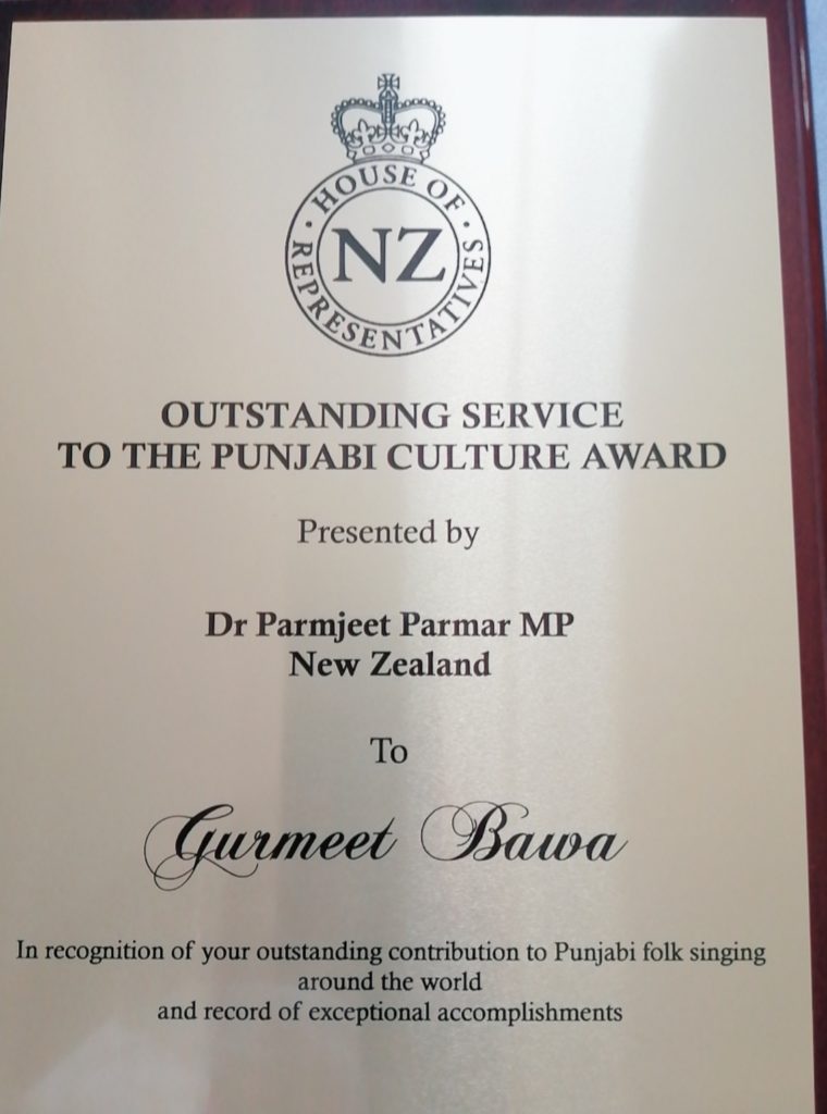The house of representative of New Zealand recently honoured the well-known Punjabi folk singer, Gurmeet Kaur Bawa for her contribution to Punjabi folk singing around the world. She is also honoured for her record of exceptional accomplishments in folk music.