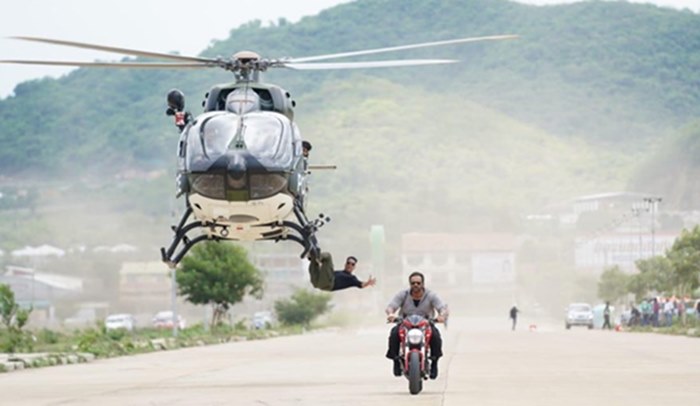 In the picture, Akshay Kumar can be seen hanging upside down from a moving helicopter, while chasing film’s director Rohit Shetty, who is riding a super bike on a runway.