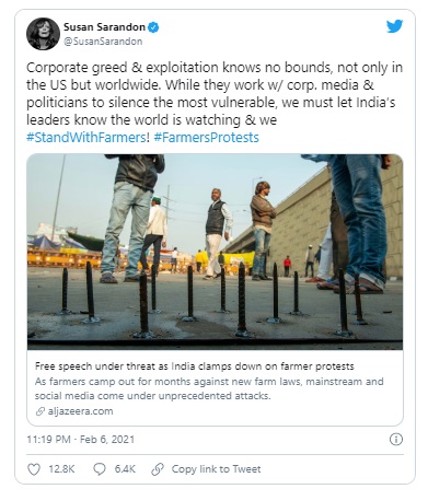 ਅਦਾਕਾਰਾ ਦੇ ਟਵੀਟ ਦੀ ਗੱਲ ਕੀਤੀ ਜਾਵੇ ਤਾਂ ਉਸ ਨੇ ਲਿਖਿਆ ਹੈ "ਕਾਰਪੋਰੇਟ ਲਾਲਚ ਤੇ ਸ਼ੋਸ਼ਣ ਦੀ ਕੋਈ ਸੀਮਾ ਨਹੀਂ, ਸਿਰਫ ਅਮਰੀਕਾ ਵਿੱਚ ਹੀ ਨਹੀਂ, ਬਲਕਿ ਪੂਰੀ ਦੁਨੀਆ ਵਿੱਚ। ਜਿੱਥੇ ਉਹ ਕਾਰਪੋਰੇਸ਼ਨ, ਮੀਡੀਆ ਤੇ ਨੇਤਾਵਾਂ ਨਾਲ ਕੰਮ ਕਰ ਰਹੇ ਹਨ ਤੇ ਕਮਜ਼ੋਰ ਲੋਕਾਂ ਦੀ ਅਵਾਜ਼ ਨੂੰ ਦਬਾਅ ਰਹੇ ਹਨ, ਸਾਨੂੰ ਭਾਰਤ ਦੇ ਨੇਤਾਵਾਂ ਨੂੰ ਇਹ ਦਿਖਾਉਣਾ ਪਏਗਾ ਕਿ ਵਿਸ਼ਵ ਉਨ੍ਹਾਂ ਨੂੰ ਦੇਖ ਰਿਹਾ ਹੈ ਤੇ ਕਿਸਾਨਾਂ ਦੇ ਨਾਲ ਖੜ੍ਹਾ ਹੈ।