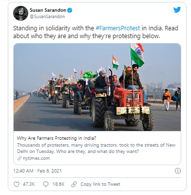 ਕਿਸਾਨਾਂ ਨੂੰ ਲਗਾਤਾਰ ਹਾਲੀਵੁੱਡ ਸਿਤਾਰਿਆਂ ਦਾ ਸਮਰਥਨ ਮਿਲ ਰਿਹਾ ਹੈ। ਇਸ ਸਭ ਦੇ ਚਲਦੇ ਹਾਲੀਵੁੱਡ ਅਦਾਕਾਰਾ ਸੁਜ਼ੈਨ ਸਰੈਂਡਨ ਨੇ ਵੀ ਟਵੀਟ ਕਰਕੇ ਭਾਰਤੀ ਕਿਸਾਨਾਂ ਦਾ ਸਮਰਥਨ ਕੀਤਾ ਹੈ ।ਅਦਾਕਾਰਾ ਦਾ ਇਹ ਟਵੀਟਰ ਲਗਾਤਾਰ ਵਾਇਰਲ ਹੋ ਰਿਹਾ ਹੈ । ਸੁਜ਼ੈਨ ਸਰੈਂਡਨ ਨੇ ਟਵੀਟ ਕਰਕੇ ਭਾਰਤ ਸਰਕਾਰ ਵੱਲੋਂ ਪੇਸ਼ ਕੀਤੇ ਖੇਤੀਬਾੜੀ ਕਾਨੂੰਨਾਂ ਦਾ ਵਿਰੋਧ ਕੀਤਾ ਹੈ।