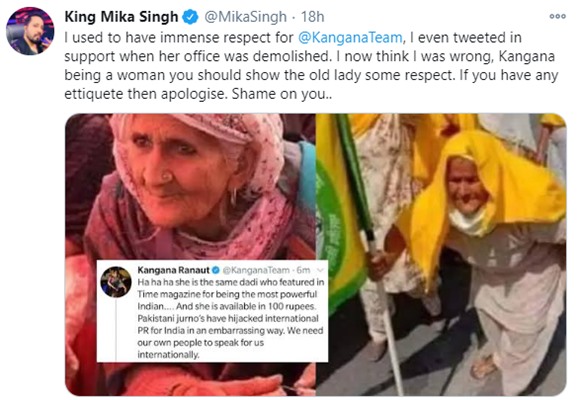 Sharing the photo and tweet of Kangana, Mika wrote, “I used to have immense respect for @kanganaranaut , I even tweeted in support when her office was demolished. I now think I was wrong, Kangana being a woman you should show the old lady some respect. If you have any etiquette then apologise. Shame on you… #farmers.”