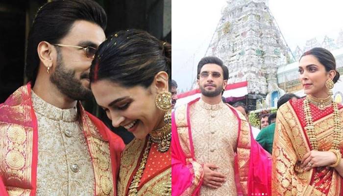 ਆਪਣੇ ਵਿਆਹ ਦੀ ਪਹਿਲੀ ਸਾਲਗਿਰ੍ਹਾ ਦੇ ਮੌਕੇ ਦੀਪਿਕਾ ਅਤੇ ਰਣਵੀਰ ਸਿੰਘ ਤਿਰੂਪਤੀ ਦੇ ਵੈਂਕਟੇਸ਼ਵਰ ਮੰਦਿਰ 'ਚ ਅਸ਼ੀਰਵਾਦ ਲੈਣ ਪਹੁੰਚੇ ਹਨ ਜਿਸ ਦੀਆਂ ਤਸਵੀਰਾਂ ਸੋਸ਼ਲ ਮੀਡੀਆ 'ਤੇ ਕਾਫੀ ਵਾਇਰਲ ਹੋ ਰਹੀਆਂ ਹਨ। ਦੀਪਿਕਾ ਅਤੇ ਰਣਵੀਰ ਇਸ ਮੌਕੇ ਕਿਸੇ ਨਵੀਂ ਵਿਆਹੀ ਜੋੜੀ ਦੀ ਹੀ ਤਰ੍ਹਾਂ ਸਜੇ ਸਵਰੇ ਨਜ਼ਰ ਆਏ।