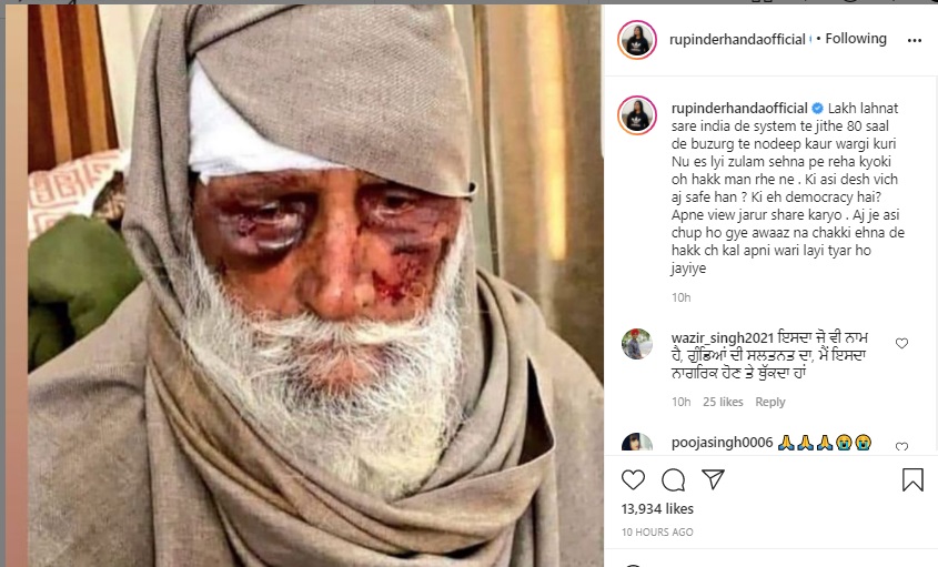 ਇਹ ਤਸਵੀਰ ਇੱਕ ਬਜੁਰਗ ਕਿਸਾਨ ਦੀ ਹੈ ਜਿਸ ਦੇ ਚਿਹਰੇ ਤੇ ਸੱਟਾਂ ਦੇ ਨਿਸ਼ਾਨ ਹਨ । ਇਸ ਤਸਵੀਰ ਨੂੰ ਸ਼ੇਅਰ ਕਰਦੇ ਹੋਏ ਰੁਪਿੰਦਰ ਹਾਂਡਾ ਨੇ ਸਰਕਾਰ ਨੂੰ ਕਈ ਸਵਾਲ ਕੀਤੇ ਹਨ । ਰੁਪਿੰਦਰ ਹਾਂਡਾ ਨੇ ਲਿਖਿਆ ਹੈ ‘ਲੱਖ ਲਾਹਨਤਾਂ ਸਾਰੇ ਇੰਡੀਆ ਦੇ ਸਿਸਟਮ ਤੇ ਜਿੱਥੇ 80 ਸਾਲ ਦੇ ਬਜੁਰਗ ਤੇ ਨੌਦੀਪ ਕੌਰ ਵਰਗੀ ਕੁੜੀ ਨੂੰ ਇਸ ਲਈ ਜੁਲਮ ਸਹਿਣਾ ਪੈ ਰਿਹਾ ਹੈ ਕਿਉਂਕਿ ਉਹ ਹੱਕ ਮੰਗ ਰਹੇ ਹਨ ।