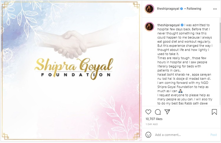 ਕੁਝ ਘੰਟੇ ਹਸਪਤਾਲ ’ਚ ਰਹਿਣ ’ਤੇ ਮੈਂ ਦੇਖਿਆ ਕਿ ਕਿਵੇਂ ਲੋਕ ਆਪਣੇ ਮਰੀਜ਼ ਨੂੰ ਗੱਡੀਆਂ ’ਚ ਲੈ ਕੇ ਬੈੱਡਾਂ ਲਈ ਬੇਨਤੀਆਂ ਕਰ ਰਹੇ ਹਨ। ਹਾਲਾਤ ਬਹੁਤ ਖਰਾਬ ਹਨ, ਸਾਨੂੰ ਸਾਰਿਆਂ ਨੂੰ ਲੋੜ ਹੈ ਇਕ-ਦੂਜੇ ਦੀ ਮਦਦ ਕਰਨ ਦੀ।’ਐੱਨ. ਜੀ. ਓ. ਦਾ ਜ਼ਿਕਰ ਕਰਦਿਆਂ ਸ਼ਿਪਰਾ ਨੇ ਲਿਖਿਆ, ‘ਮੈਂ ਲੋਕਾਂ ਦੀ ਮਦਦ ਲਈ ਅੱਗੇ ਆ ਰਹੀ ਹਾਂ ਤੇ ਇਸ ਲਈ ਮੈਂ ਸ਼ਿਪਰਾ ਗੋਇਲ ਫਾਊਂਡੇਸ਼ਨ ਨਾਂ ਦੀ ਐੱਨ. ਜੀ. ਓ. ਬਣਾਈ ਹੈ, ਜਿਸ ਰਾਹੀਂ ਮੈਂ ਵੱਧ ਤੋਂ ਵੱਧ ਲੋਕਾਂ ਦੀ ਮਦਦ ਕਰ ਸਕਾਂ’।