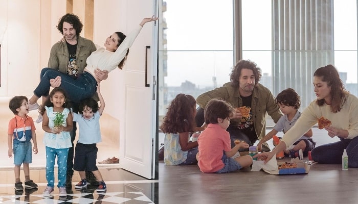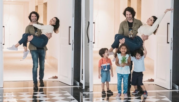 She shared many images; one of them depicted Sunny and Daniel entering their new house while Daniel is seen carrying Sunny into the residence in the first image. In the other images, their children, Nisha, Noah, and Asher, are shown having pizza with their parents.