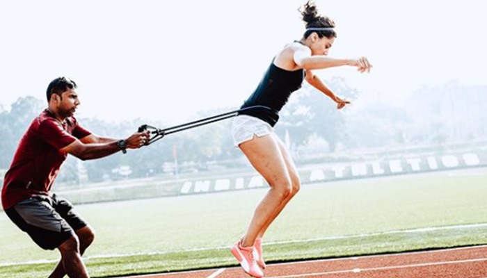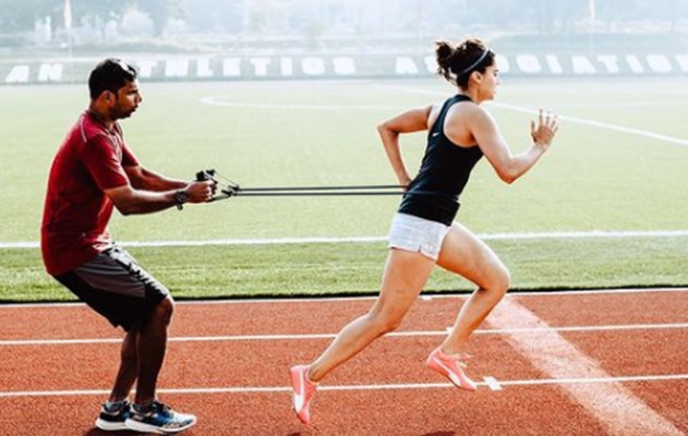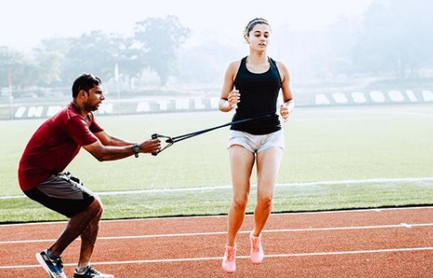 The new pictures show Taapsee on track, in a training session with her trainer. She is seen in a black top and white shorts, working on her body and strength.