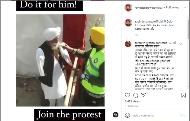 ਗਾਇਕ ਰਵਿੰਦਰ ਗਰੇਵਾਲ ਨੇ ਵੀ ਆਪਣੇ ਇੰਸਟਾਗ੍ਰਾਮ ਤੇ ਇੱਕ ਵੀਡੀਓ ਸ਼ੇਅਰ ਕੀਤਾ ਹੈ ਜਿਹੜਾ ਕਿ ਦਿਲ ਨੂੰ ਛੂਹ ਜਾਣ ਵਾਲਾ ਹੈ । ਇਸ ਵੀਡੀਓ ਨੂੰ ਦੇਖ ਕੇ ਹਰ ਕੋਈ ਭਾਵੁਕ ਵੀ ਹੋ ਜਾਂਦਾ ਹੈ । ਵੀਡੀਓ ਦੀ ਗੱਲ ਕੀਤੀ ਜਾਵੇ ਤਾਂ ਇਹ ਵੀਡੀਓ ਇੱਕ ਬਜ਼ੁਰਗ ਦਾ ਹੈ । ਜਿਸ ਦੇ ਦੋਵੇਂ ਹੱਥ ਨਹੀਂ ਹਨ, ਪਰ ਉਹ ਕਿਸਾਨਾਂ ਦੇ ਨਾਲ ਖੇਤੀ ਬਿੱਲਾਂ ਦੇ ਖਿਲਾਫ ਡਟਿਆ ਹੋਇਆ ਹੈ ।