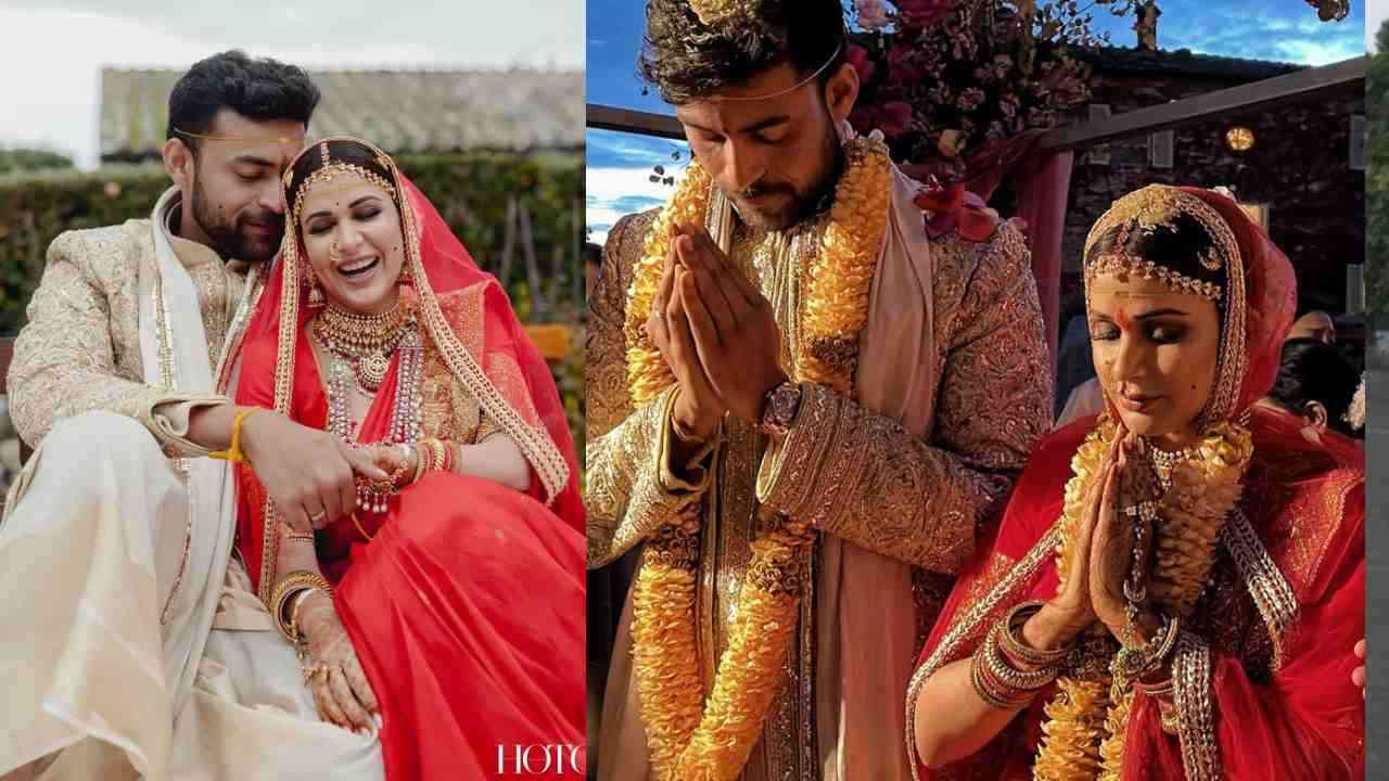The newlyweds, Varun Tej and Lavanya Tripathi, looked resplendent in their wedding attire. Varun donned an intricately embroidered sherwani with a matching shawl, exuding elegance and charm. Lavanya, hailing from Uttar Pradesh, looked radiant in a scarlet bridal ensemble, which was complemented by a delicate net dupatta. Her bridal ensemble was adorned with exquisite gold jewelry, including a necklace, bangles, hand accessories, a forehead ornament, and coordinating hair adornments. The photos captured by Nagaendra Babu show the couple with closed eyes and folded hands, symbolizing the sacredness of the moment.
